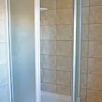 Sprcha, osušky a ručníky jsou nabízeny v koupelně.
